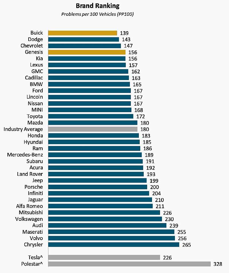 Самыми беспроблемными автомобилями признали Buick, Dodge и Chevrolet. А в конце рейтинга качества оказались электрокары Tesla и Polestar (суббренд Volvo). Электромобили в целом куда менее надежны, и по статистике на каждые 100 машин приходится 240 различных проблем. Хотя JD Power заявляют, что этот показатель снизился, раньше их в среднем было 251.