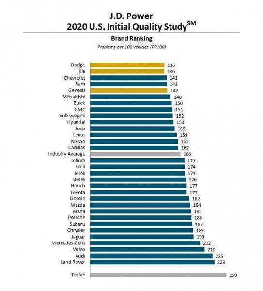 Потому что в среднем на 100 автомобилей у Tesla насчитывается 250 различных проблем, о которых хозяева сообщали в первые 90 дней владения. Тогда как средний показатель — 166, то есть примерно на 30% ниже. Вот для сравнения рейтинг с остальными участниками: