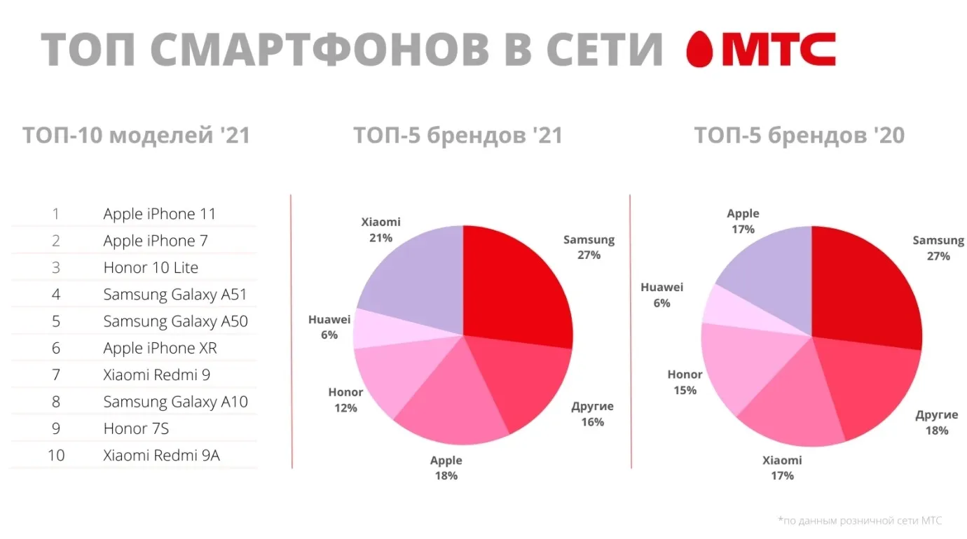 Интересно, что в прошлом году абоненты МТС начали активно переходить на смартфоны Xiaomi. По итогам 2021-го их количество увеличилось на 21%, а вот ряды владельцев техники Apple пополнились всего на 7%.