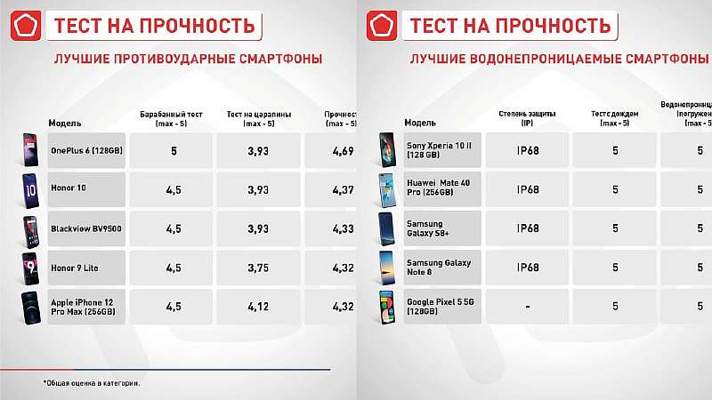 Сначала телефоны проходили два этапа проверки на прочность, а затем тестировалась их водонепроницаемость. Самым удароустойчивым смартфоном оказался OnePlus 6. В пятерку прочнейших также попали Honor 10, Blackview BV9500, Honor 9 Lite и Apple iPhone 12 Pro Max.