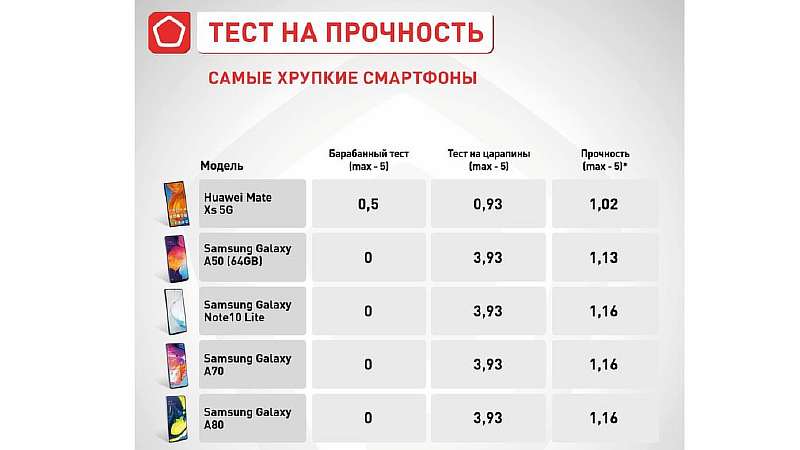 Самым хрупким девайсом оказался гибкий Huawei Mate XS. Кроме того, в антирейтинг попали Samsung Galaxy A50, Samsung Galaxy Note 10 Lite, Samsung Galaxy A70 и Samsung Galaxy A80.