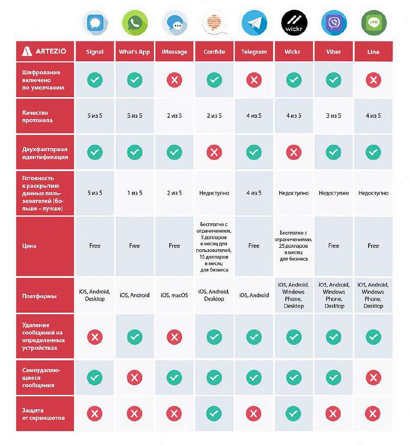 Всего критериев проверки было тридцать. Среди них наличие надёжной системы шифрования чатов и передачи данных, потенциальная готовность раскрыть пользовательские данные третьим лицам, хранение истории и синхронизация сообщений, стоимость использования и поддерживаемые платформы.