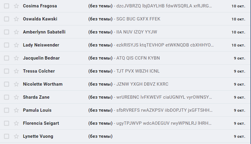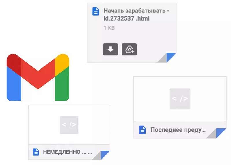 Типичное сообщение подобного рода выглядит так: тема отсутствует, получателей сразу несколько, текст содержит случайный набор символов, а к письму приложен файл формата html с кликбейтным названием. Вложения не несут совсем уж опасных для компьютера вирусов, но с их помощью мошенники узнают, кто потенциально готов нажимать куда не следует, и пополняют свою базу данных.