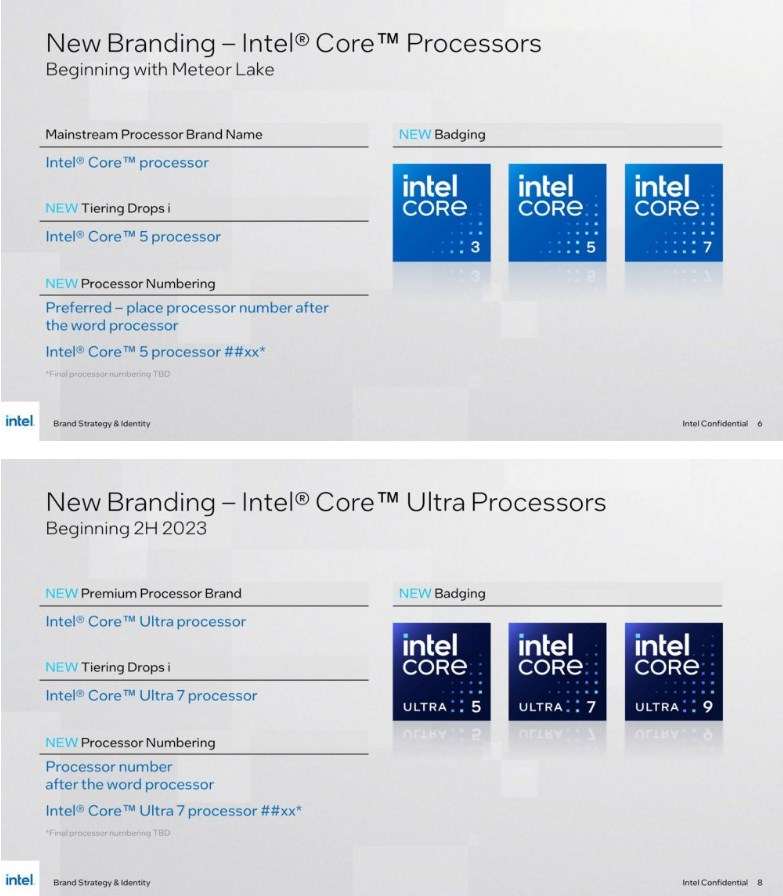 Названия всех процессоров Intel с 2008 года сопровождает буква «i», которая была введена с запуском моделей Core 9xx на архитектуре Nehalem. Однако теперь компания решила сменить маркировку, что аргументирует большим количеством нововведений в грядущих моделях Meteor Lake.