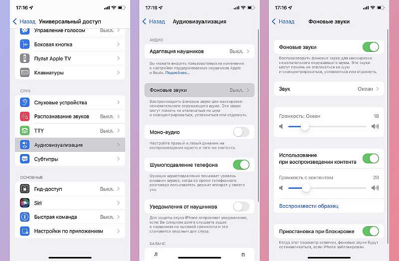 Чтобы найти и активировать белый шум на iPhone, нажмите «Настройки» > «Универсальный доступ» > «Аудиовизуализация» > «Фоновые звуки», и активируйте главный переключатель. Здесь вы сможете выбрать из различных вариантов белого шума, отрегулировать громкость и настроить воспроизведение в фоновом режиме, в том числе при прослушивании аудиокниг и подкастов.