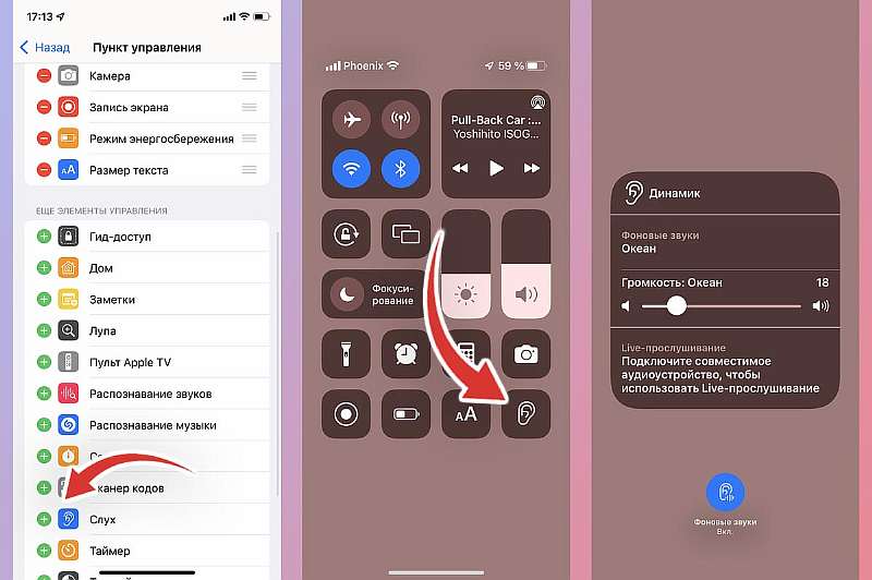 Также Apple предусмотрела возможность добавить ярлык «Фоновых звуков» на панель управления. Для этого перейдите в «Настройки» > «Пункт управления» и перетащите в активные переключатель «Слух». В шторке появится иконка уха, клик по которой быстро включает белый шум, а долгое нажатие открывает его настройки.