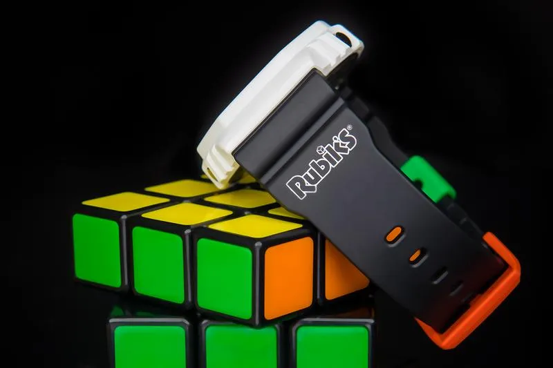 Ретро-дизайн циферблата с цветами куба на заднем фоне – не единственная отсылка к головоломке, оформление ремешка так же демонстрирует, чем вдохновлялись дизайнеры. В комплекте идет сразу две лицевые панели – белая и черная, так что любители менять внешний вид аксессуара будут в восторге. Футляр – еще одна фишка, он тоже напоминает культовый кубик.