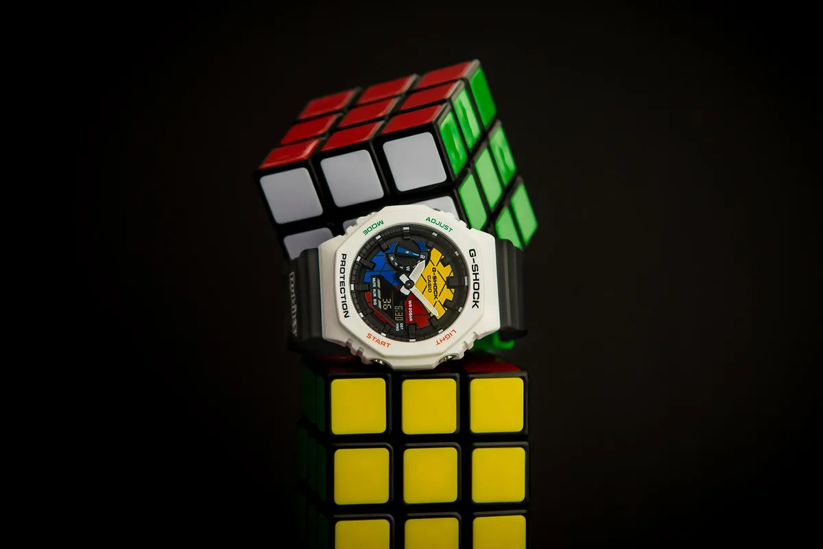 Японский производитель часов Casio представил свою новейшую коллаборацию – ей стала лимитированная серия Rubik’s x G-Shock GAE-2100RC-1AER. В продажу она поступит 9 февраля, а вдохновлена, как явственно следует из названия, легендарным кубиком Рубика. К тому же это первый коллаб, в котором используется восьмиугольная форма корпуса, свойственная моделям линейки GA-2100 – неубиваемым рабочим лошадкам.