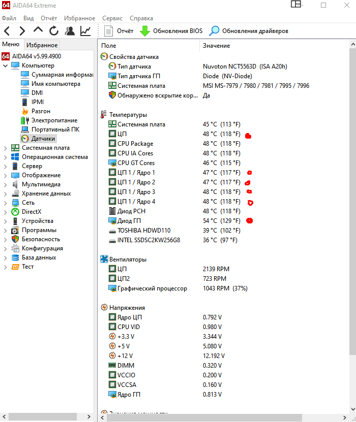- В появившемся окне вы увидите температуру всех комплектующих вашей системы. Температура ядер процессора указана в строчках ЦП1, ЦП2, ЦП3 и т.д. Температуру видеокарты вы найдете в строчке Диод ГП, ниже — температура жесткого диска и SSD накопителя.