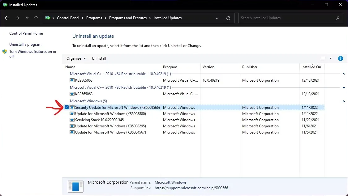 Для этого нужно перейти в «Панель управления»➝ «Программы» ➝ «Просмотреть установленные обновления» и удалить патч с индексом KB5009543 (для Windows 10) или KB5009566 (для Windows 11).