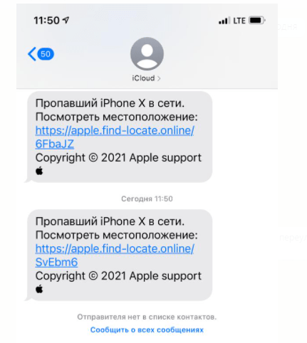 А дальше началось интересное. На телефон, указанный в качестве контактного, стали приходить SMS, отправителем которых значился iCloud. Текст сообщений гласил: «Пропавший iPhone X в сети. Посмотреть местоположение», и прикладывалась ссылка якобы на сайт Apple, где можно узнать координаты утерянного гаджета.
