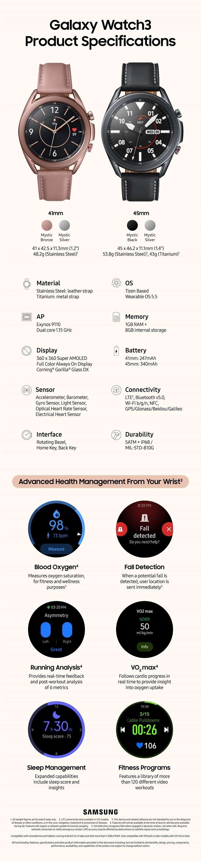 Смарт-часы Galaxy Watch 3 поставляются в двух размерах: 41 и 45 мм. Обе модели водонепроницаемы до 5 АТМ, имеют встроенную память и предлагают расширенные функции мониторинга состояния здоровья. Часы измеряют насыщение крови кислородом, анализируют сон, определяют падения и умеют отслеживать более 40 видов тренировок.