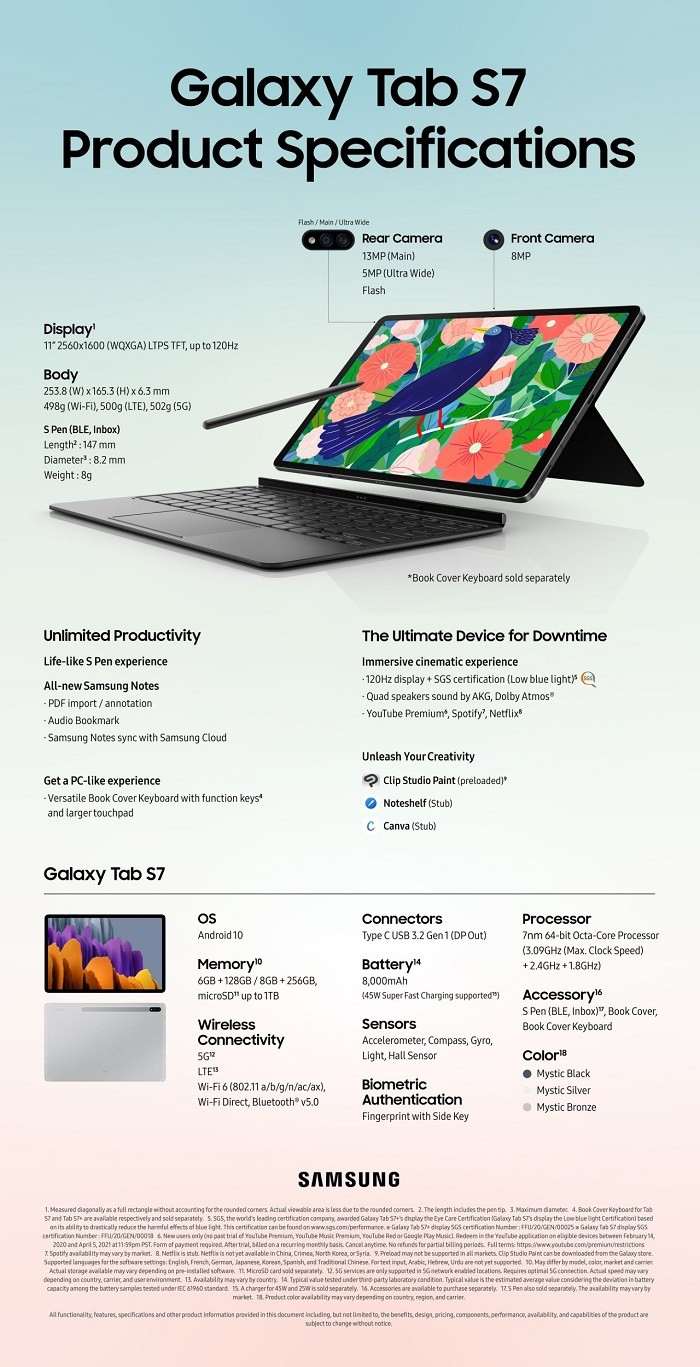 Топовые планшеты Galaxy Tab S7 и Galaxy Tab S7+ выходят с диагональю 11 и 12.4 дюйма соответственно. Используется AMOLED матрица с частотой обновления 120 ГЦ. Емкость аккумулятора составляет 8000 мАч в базовом варианте и 10 090 мАч в S7+ Plus.