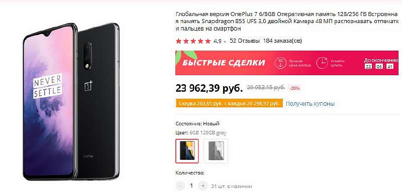 Если вы давно хотели купить себе OnePlus 7, то сейчас самое время. Официальный магазин компании на площадке AliExpress отдает глобальную версию смартфона по шаровой цене 23 962 рубля. Настолько дешево семерка никогда не продавалась даже в Китае, а у российских серовозов она и вовсе стоит от 30 тысяч.