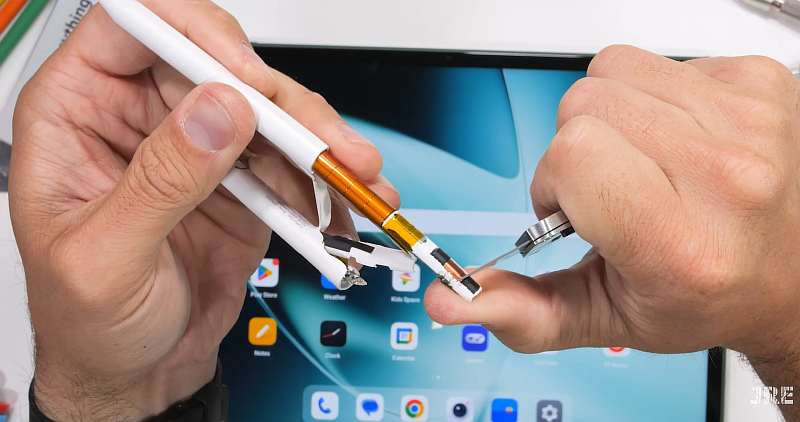 Прежде чем начать издевательства над планшетом, блогер решил разобрать стилус. Но нож для такого дела оказался не особо сподручным, поэтому в итоге Нельсон просто сломал аксессуар. Внутри ничего особенного: медная катушка для беспроводной зарядки, аккумулятор на 82 мАч и электроника, регистрирующая нажатия.