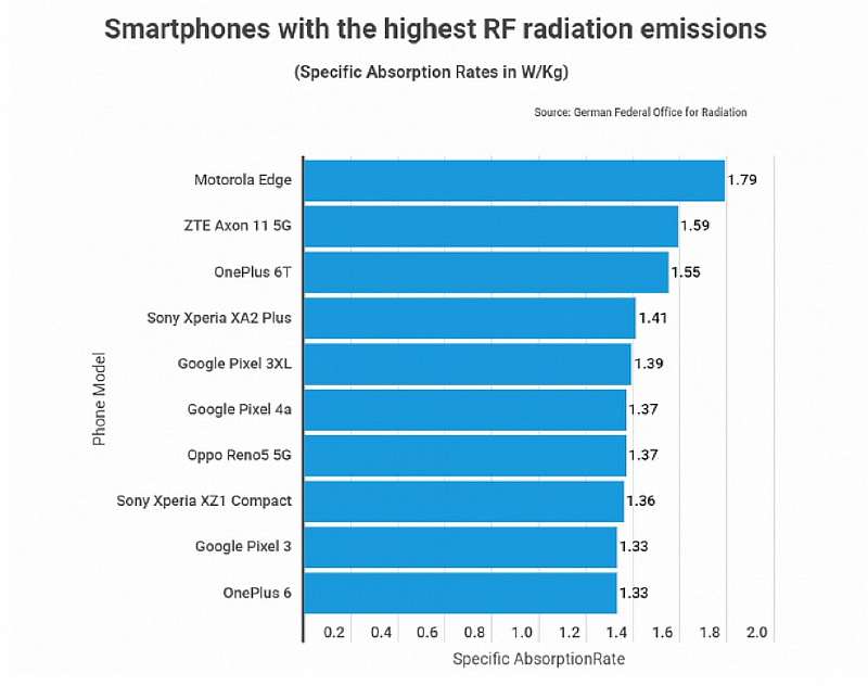Ресурс Bankless Times на днях опубликовал исследование, показывающие, какие смартфоны являются самыми опасными по количеству излучения. Первое место в антирейтинге занял Motorola Edge с показателем SAR 1.79 Вт/кг. Больше моделей, перешагнувших «красную черту» в списке не оказалось. Правда, ZTE Axon 11 5G и OnePlus 6T вплотную к ней приблизились. Их результат – 1.59 и 1.55 Вт/кг соответственно.