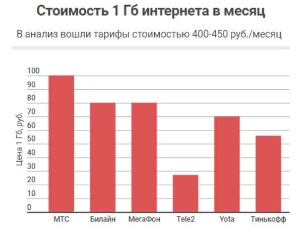Согласно анализу тарифных планов с лимитированным трафиком и ежемесячной платой до 450 рублей, самые низкие цена на мобильный интернет оказались у оператора «Tele2» – 27 руб за 1 ГБ. С существенным отрывом на втором и третьем местах находятся «Тинькофф Мобайл» и «Yota», у которых стоимость 1 ГБ мобильного интернета составляет 55 и 70 рублей соответственно. Далее — «Билайн» и «МегаФон» с одинаковой стоимостью в 80 руб/1 ГБ, и самым дорогим был признан «МТС» — почти 100 руб. за 1 ГБ.