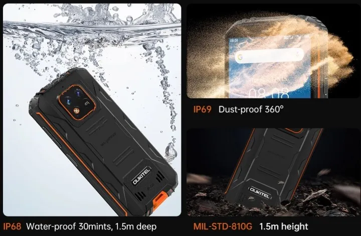 Прорезиненный корпус Oukitel WP18 с металлическими вставками защищен от влаги и пыли по стандарту IP68/IP69, а также соответствует военному стандарту ударопрочности MIL-STD-810G. Телефон можно ронять на твердые поверхности с высоты до 1.5 метров, эксплуатировать прямо под дождем, под водой и подвергать прочим подобным «испытаниям».