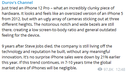 Павел Дуров опубликовал в личном Telegram канале пост, в котором поделился впечатлениями от покупки iPhone 12 Pro. Мягко говоря, девайс Дурову не понравился – он жестко раскритиковал новинку, проехался по компании Apple и предсказал ей серьезные проблемы.