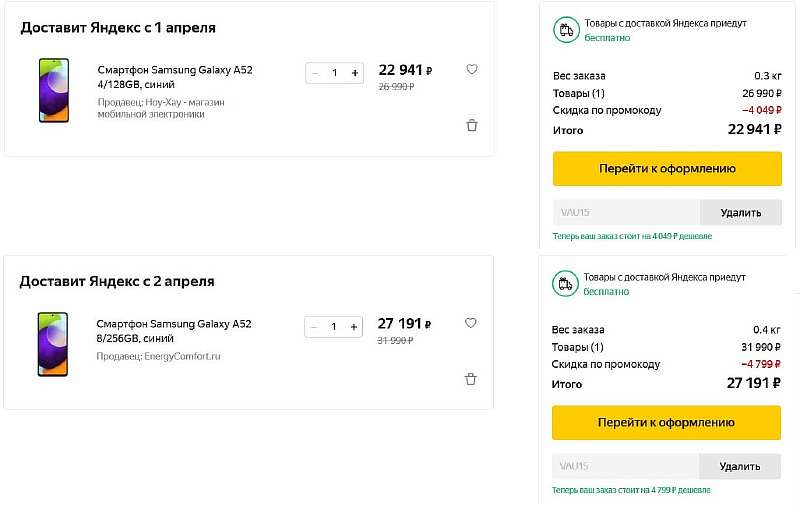 Чтобы забрать Galaxy A52 по акции, залетайте на Яндекс.Маркет по ссылкам ниже и используйте промокод VAU15. Скидки на ЯМ никогда не длятся долго – распродажа завершится уже 1 апреля.