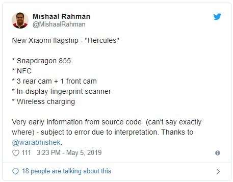 Главный редактор портала XDA опубликовал первую информацию о следующем флагмане компании Xiaomi, который сейчас проходит тестирование под кодовым названием Hercules. Аппарат получит процессор Snapdragon 855, работающий на тактовой частоте 2.84 ГГц, тройную основную камеру, AMOLED дисплей со встроенным сканером, поддержку беспроводной зарядки и NFC.