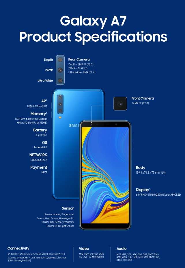 Корейский производитель анонсировал свой первый смартфон с тройной камерой, и им оказался не флагман, а аппарат среднего уровня – Galaxy A7. Новинку оснастили модулем из трех объективов – главный сенсор на 25 МП со светосилой f/1.7, широкоугольный модуль 8МП f/2.4 и дополнительный 5 МП f/2.2 для измерения глубины резкости при съемке в портретном режиме. Разрешение фронтальной камеры составляет 24 МП (f/2.0).