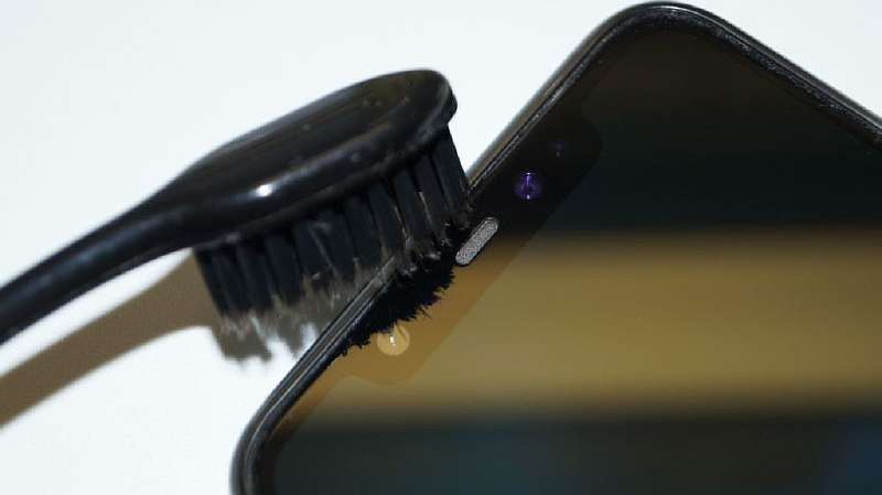 - Берем зубную щетку и прочищаем сетку разговорного динамика. Желательно использовать ту, у которой кончики щетины заострены, чтобы они лучше проникали в отверстия.