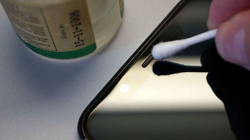 - Настает черед спирта и ватных палочек. Окунаем палочку в жидкость и слегка надавливая на нее, протираем динамик. Ватку старайтесь смачивать не сильно, достаточно слегка окунуть ее в спирт. Дайте динамику подсохнуть три минуты.