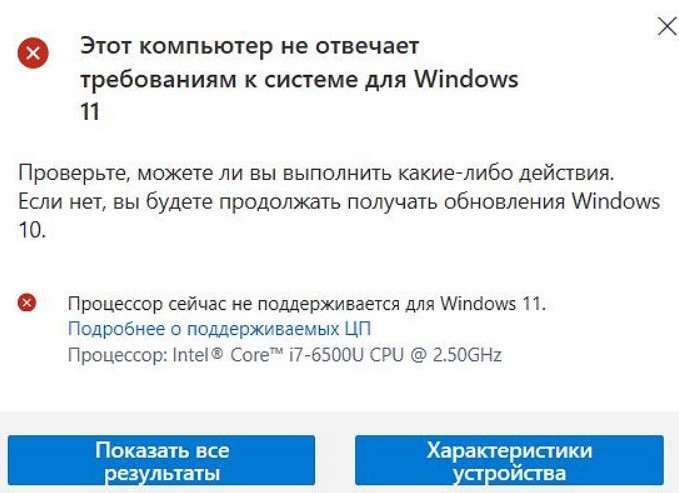 Если машина не поддерживает Windows 11, приложение подробно распишет конкретные причины несовместимости компьютера с новой ОС. Выглядит это следующим образом: