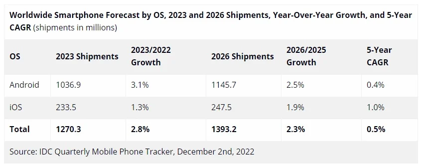 Сегмент новых смартфонов таким похвастаться не может — в 2022 году на рынок было поставлено 1.24 млрд устройств, что на 9% меньше, чем в 2021 году. Однако в новом, 2023 году, ожидается увеличение поставок на 2.8% в годовом исчислении до ~ 1.27 миллиарда единиц. Дальше, по прогнозам, показатели будут возвращаться к норме, и в 2026 году ожидается продажа ~1.39 миллиарда смартфонов.