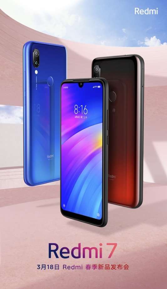 Новинку представят 18 марта в Китае, где также дебютирует Redmi Note 7 Pro для китайского рынка, который ранее был анонсирована в Индии. Опубликованный руководителем постер также раскрывает дизайн Redmi 7, который будет мало чем отличаться от популярного RN7 – материал корпуса неизвестен, но визуально мы имеем все те же относительно тонкие рамки, каплевидный вырез под фронталку и вертикальную двойную камеру со сканером отпечатков пальцев на задней панели.