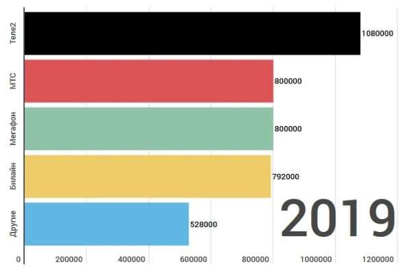 Было бы интересно взглянуть еще и на точную статистику по количеству абонентов, которые уходили от того или иного мобильного оператора, но подобных данных, к большому сожалению, не предоставили. Зато есть другая информация, касающаяся числа клиентов, которых приобрели или потеряли компании за 2019-й год. У Tele2 прирост абонентской базы на 1880000 абонентов, что абсолютный рекорд, у «Билайна» же потери в 920187 клиентов — антирекорд.