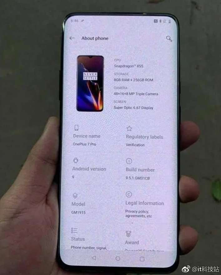 Утекшие в сеть снимки демонстрируют смартфон с модельным номером GM1915, аппарат с аналогичным индексом был зарегистрирован в базе данных Bluetooth SIG в конце минувшего месяца. Это OnePlus 7 Pro, который судя по информации на экране получит процессор Snapdragon 855, 8 ГБ оперативной и 256 ГБ постоянной памяти. Диагональ дисплея составит 6.67 дюйма. Матрица, которую производитель именовал Optic AMOLED, теперь будет называться Super Optic. Камера у флагмана тройная, на 48+16+5 МП