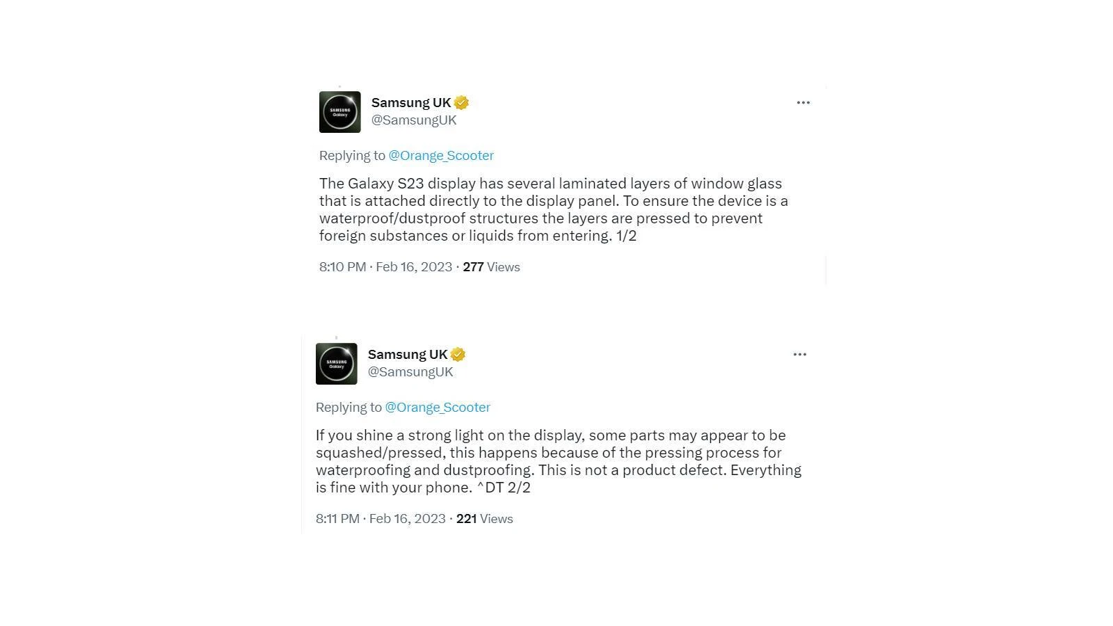 Отвечая на вопрос в Твиттере, британский аккаунт Samsung, написал, что это не заводской брак, а вполне нормальное явление. «Когда над экраном Galaxy S23 Ultra проецируется сильный источник света, вы можете видеть характерное отражение на защитном стекле. Это следствие процесса прессования экрана, необходимого для гидроизоляции и пылезащиты корпуса. С самой матрицей все в порядке, это не дефект продукта» – пишет Samsung.