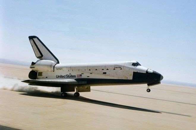 Еще один фантастический снимок Колумбии, снятый в 1981 году, демонстрирует, как шаттл приземляется на сухое озеро Роджерс на базе ВВС Эдвардс в южной Калифорнии.