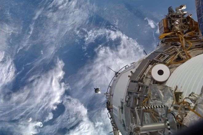 На этом снимке 2010 года изображен беспилотный летательный аппарат, приближающийся к Международной космической станции. Он приносит с собой еду, кислород, топливо и расходные материалы для экипажа.