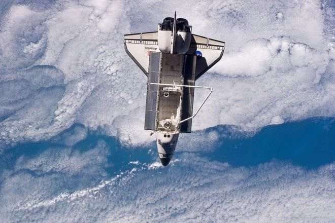 Здесь показан космический челнок Атлантис во время миссии по пополнению запасов МКС в 2010 году. Шаттл и его команда участвовали в добавлении нового модуля к Международной космической станции, а также в замене батарей и пополнении продовольствия.