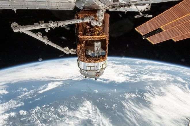 Эта фотография 2012 года показывает процесс пополнения запасов Международной космической станции. К МКС прикреплен японский корабль H-II Transfer Vehicle-3, удерживаемый роборукой канадского производства.