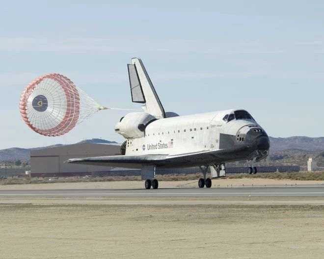Еще один снимок Индевора показывает, как космический челнок приземляется на базе ВВС Эдвардс после 16-дневной миссии, в ходе которой шаттл преодолел 6.6 миллионов миль.