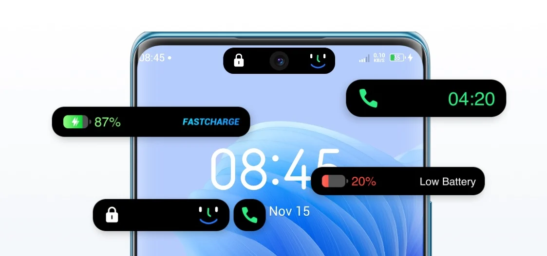 Нет сомнений, что дизайнеры этого смартфона вдохновлялись Apple – сходство с «яблочными» устройствами можно увидеть в виджете, напоминающем Dynamic Island. Его даже назвали аналогичным образом – Dynamic Bar. Анимации вокруг фронталки будут сообщать об успешном распознавании лица пользователя, продолжительности голосовых вызовов, низком заряде аккумулятора и прогрессе зарядки.