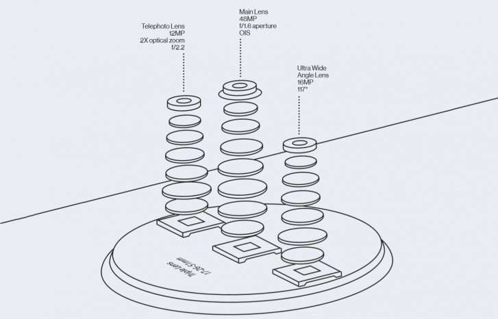 - Основная камера: 48 МП (Sony IMX586, f/1.6, 0.8 мкм, OIS) + 12 МП (f/2.2, 1 мкм, телефото) + 16 МП (f/2.2, угол обзора 117 градусов), 4К видео;