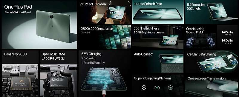 OnePlus Pad имеет размеры 258.03 × 189.41 × 6.54 мм, это действительно тонкий и легкий планшет весом 552 грамма. При этом внутри установлен мощный процессор Dimensity 9000, 8/12 ГБ оперативной памяти LPDDR5 и 128 ГБ встроенной встроенной памяти UFS 3.1. Из коробки устройство будет работать под управлением Android 13 с интерфейсом OxygenOS 13.1, а за его питание будет отвечать батарея емкостью 9510 мАч, которая заряжается по проводу мощностью 67 Вт (до 100% за 60 минут). OnePlus утверждает, что планшет может проработать в режиме ожидания целый месяц.