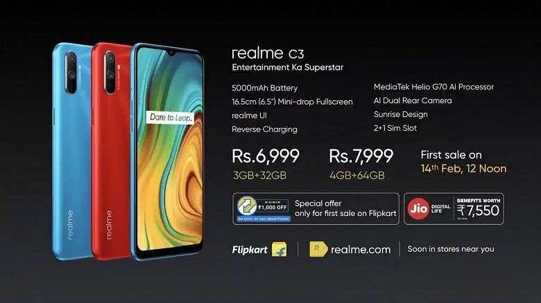 Старт продаж Realme C3 в Индии запланирован на 14 февраля. Цена смартфона, в зависимости от конфигурации, составит: