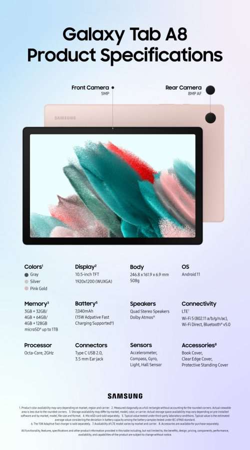 Что касается остальных характеристик Galaxy Tab A8 10.5, он получил АКБ на 7040 мАч с поддержкой 15-ваттной зарядки (в комплекте идет адаптер на 7.5 Вт), 8-мегапиксельную основную камеру и фронталку на 5 МП. Будет две версии – с Wi-Fi и LTE. Из коробки устройство работает под управлением Android 11, а в будущем обновится до 12-й версии ОС.