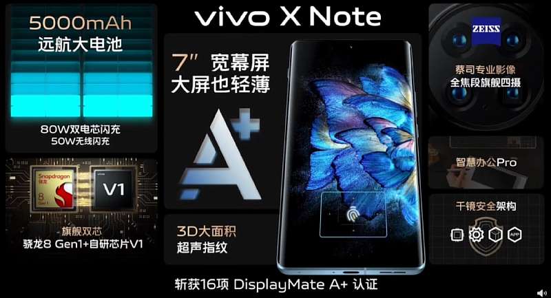 Новинка получила топовый процессор Snapdragon 8 Gen 1, которому ассистируют 12 ГБ оперативной и 512 ГБ постоянной памяти. Для борьбы с перегревом производитель оснастил устройство системой охлаждения из испарительной камеры с графитовой подложкой. Работает Vivo X Note под управлением Android 12 с фирменным интерфейсом Origin OS.