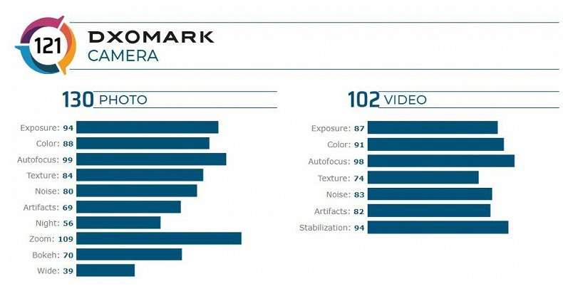 Вторая камера является 5 МП телеобъективом с OIS, который может обеспечить 5-кратный оптический и 50х гибридный зум. Набор дополняет 20 МП ширик с углом обзора 117°, портретный 12 МП модуль с 2-кратным оптическим приближением (имеет эквивалентное фокусное расстояние 50 мм для наиболее естественной перспективы) и 2 мегапиксельная макрокамера.
