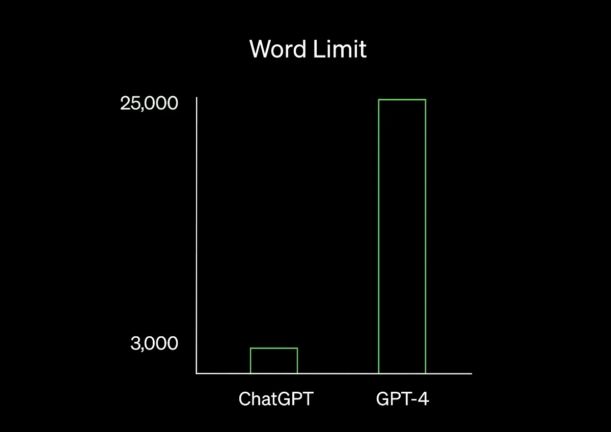 По сравнению с ChatGPT, способным генерировать в ответе до 3000 слов, GPT-4 сможет генерировать до 25 000 слов.