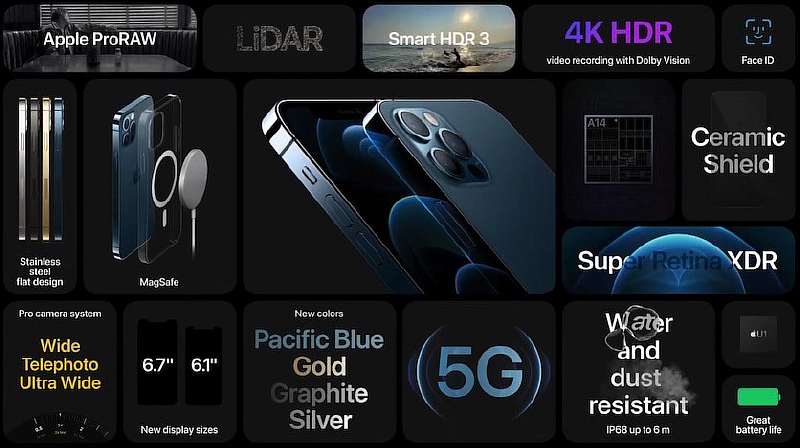За производительность устройств отвечает новейший 5-нанометровый чипсет A14 Bionic, являющийся «самым мощным мобильным процессором в истории». Камера у iPhone 12 Pro тройная, разрешение каждого модуля составляет 12 МП, а светосила варьируется от f/1.6 на главном объектива до f/2.0 на телевике. Из главных нововведений по съемке: ночной режим на ультраширике, улучшенная оптическая стабилизация, прирост скорости работы DeepFusion и обновленный Smart HDR 3.0.