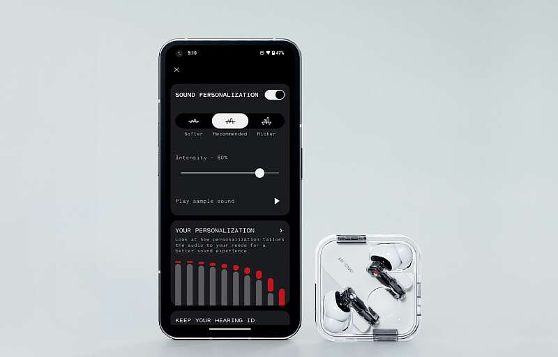 За качество звука отвечают динамические драйвера диаметром 11.6 миллиметров с диафрагмой из комбинации полиуретана и графена, расположенной в специальной двухкамерной конструкции. В фирменном приложении Nothing X пользователь может персонализировать звук с помощью эквалайзера или предустановленных пресетов.
