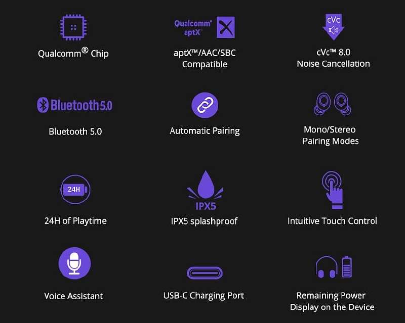 Tronsmart Onyx Neo работают на чипе от Qualcomm, поддерживают кодеки AAC и AptX и подключаются к смартфону по интерфейсу Bluetooth 5.0. Наушники имеют сенсорное управление и заряжаются через порт Type-C, заявлена защита от влаги по стандарту IPX5. Производитель обещает 7 часов воспроизведения музыки на одном заряде и 24 с подзарядкой от кейса.